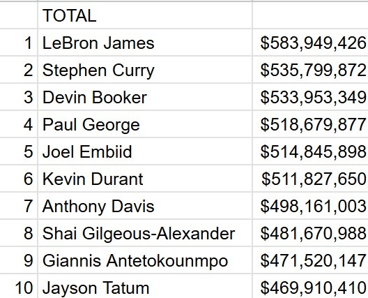 据美媒HoopsHype统计,布克目前是NBA历史上薪资第3的球员。