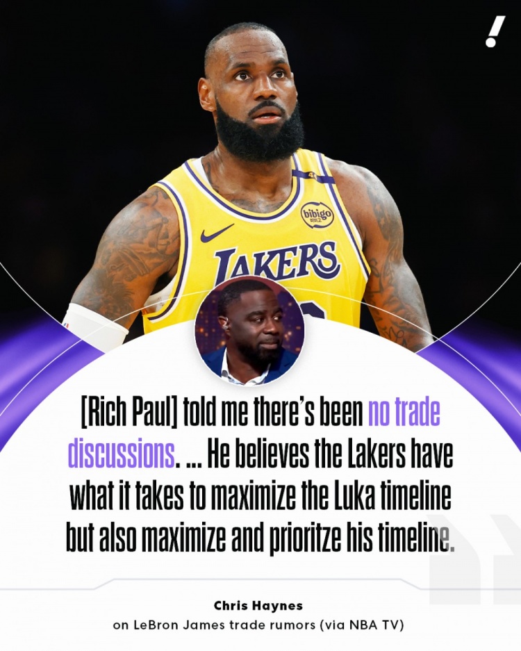 “他说的就是这些,他告诉我,目前没有与湖人进行任何交易谈判。网上有一些人们猜测的他也许有意加盟的球队,我被告知,所有那些讨论都是假的。双方没有讨论过交易,也没有讨论过续约。他显然已经选择了执行选项,并且他渴望赢得胜利。他相信湖人有能力最大化利用卢卡的时间线,同时也能最大化且优先考虑他的时间线。所以,里奇-保罗想要澄清的就是这些。”