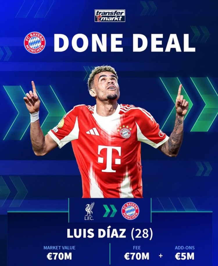 7月30日讯 拜仁已经官宣签下28岁的利物浦边锋路易斯-迪亚斯,多方消息透露利物浦方面认为这样的报价无法拒绝。