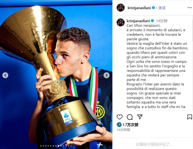 阿斯拉尼社媒写道:“亲爱的国米球迷们,现在是向大家告别的时候了,相信我,找到合适的言辞真的不容易。穿上国米的球衣是我儿时怀揣的梦想,那时我怀着满心的崇拜为国米球员们加油。