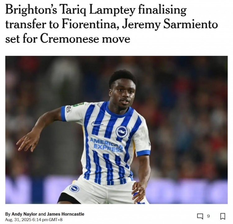 报道称,预计布莱顿缩减阵容的计划将在夏窗最后阶段继续进行,兰普泰以及萨米恩托将转会至意大利俱乐部。