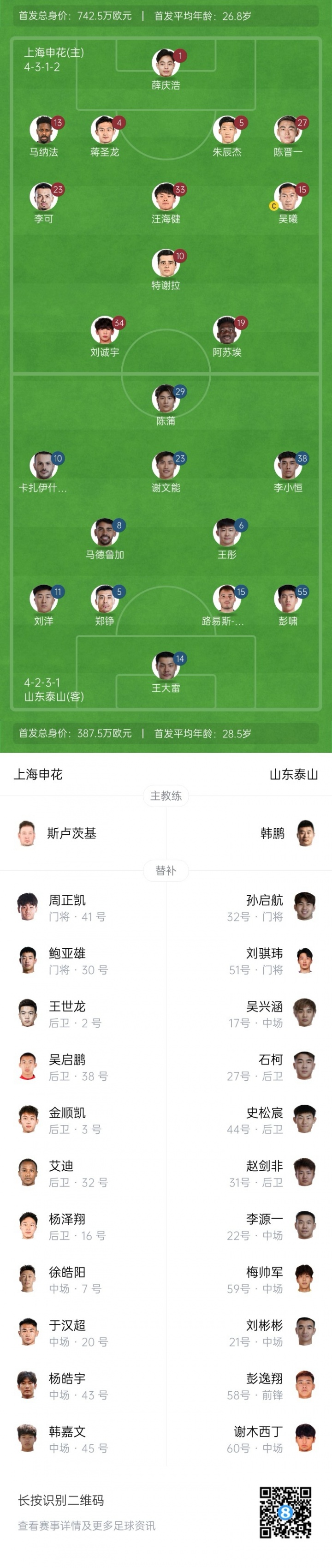 上海申花首发:1-薛庆浩、4-蒋圣龙、5-朱辰杰、13-马纳法(F)、27-陈晋一、15-吴曦、23-李可、33-汪海健、10-特谢拉(F)、19-阿苏埃(F)、34-刘诚宇
