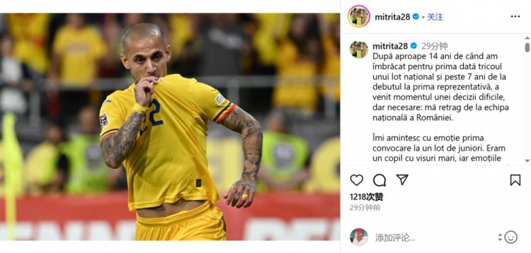 米特里策在社媒写道:“在首次穿上国家队球衣近14年、完成一线队首秀逾7年之后,我迎来了一个艰难却必要的决定:从罗马尼亚国家队退役。